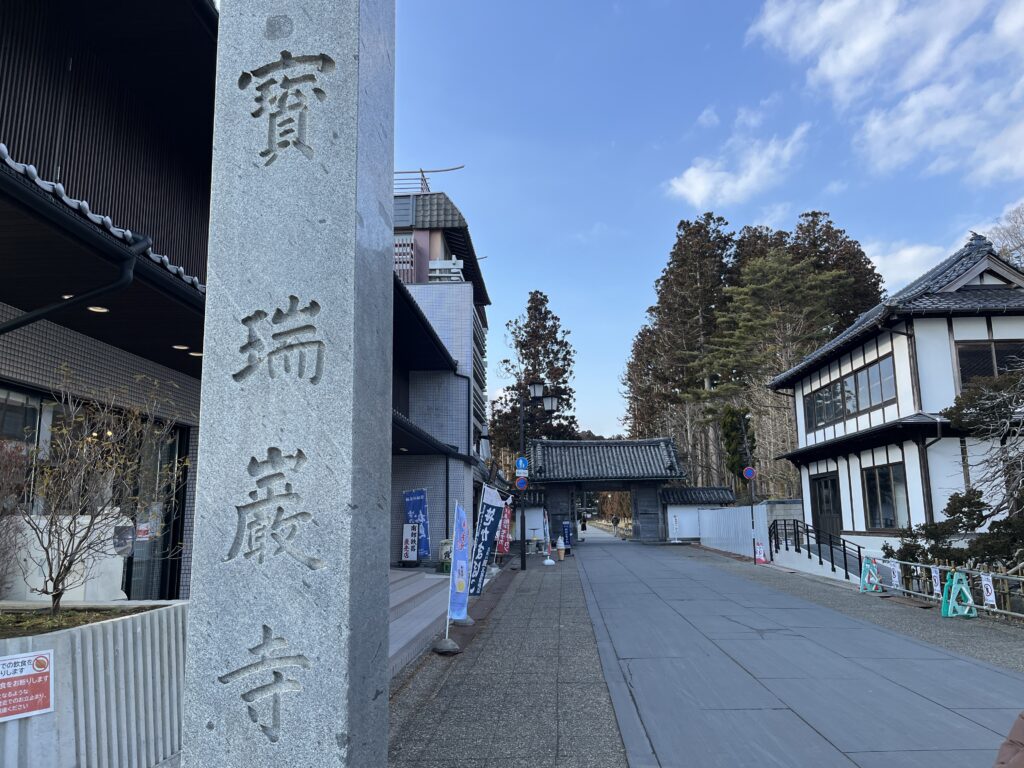 瑞巌寺へと続く真っすぐな道です。なかは金色のふすまが豪華で、立派な本堂があります。また、宝物館にも見どころがたくさん。