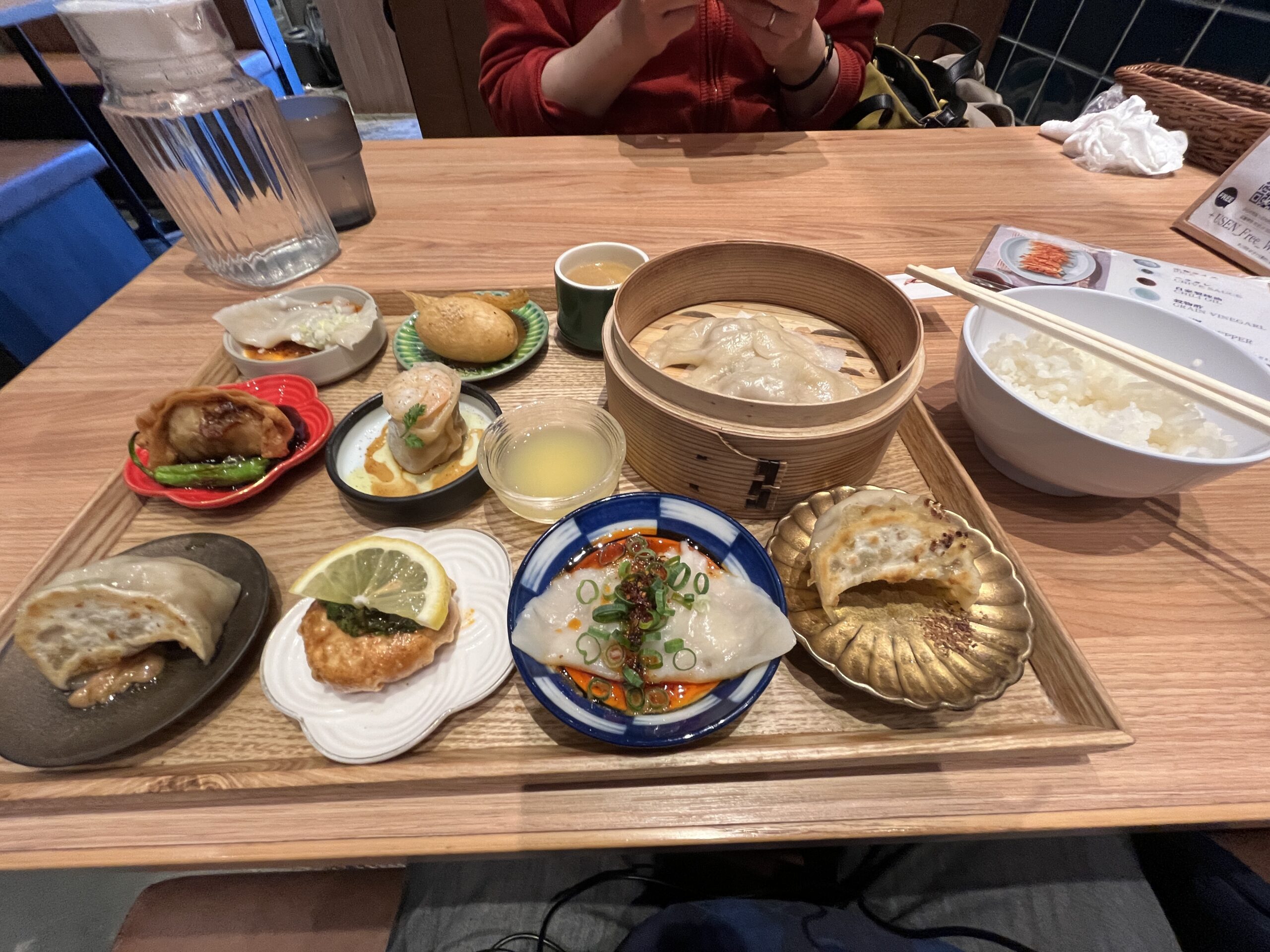 甲子園プラスにあるレストランで昼食をとりました。餃子御膳です。いろいろな餃子を楽しめます。ちょっと辛いものもありました。