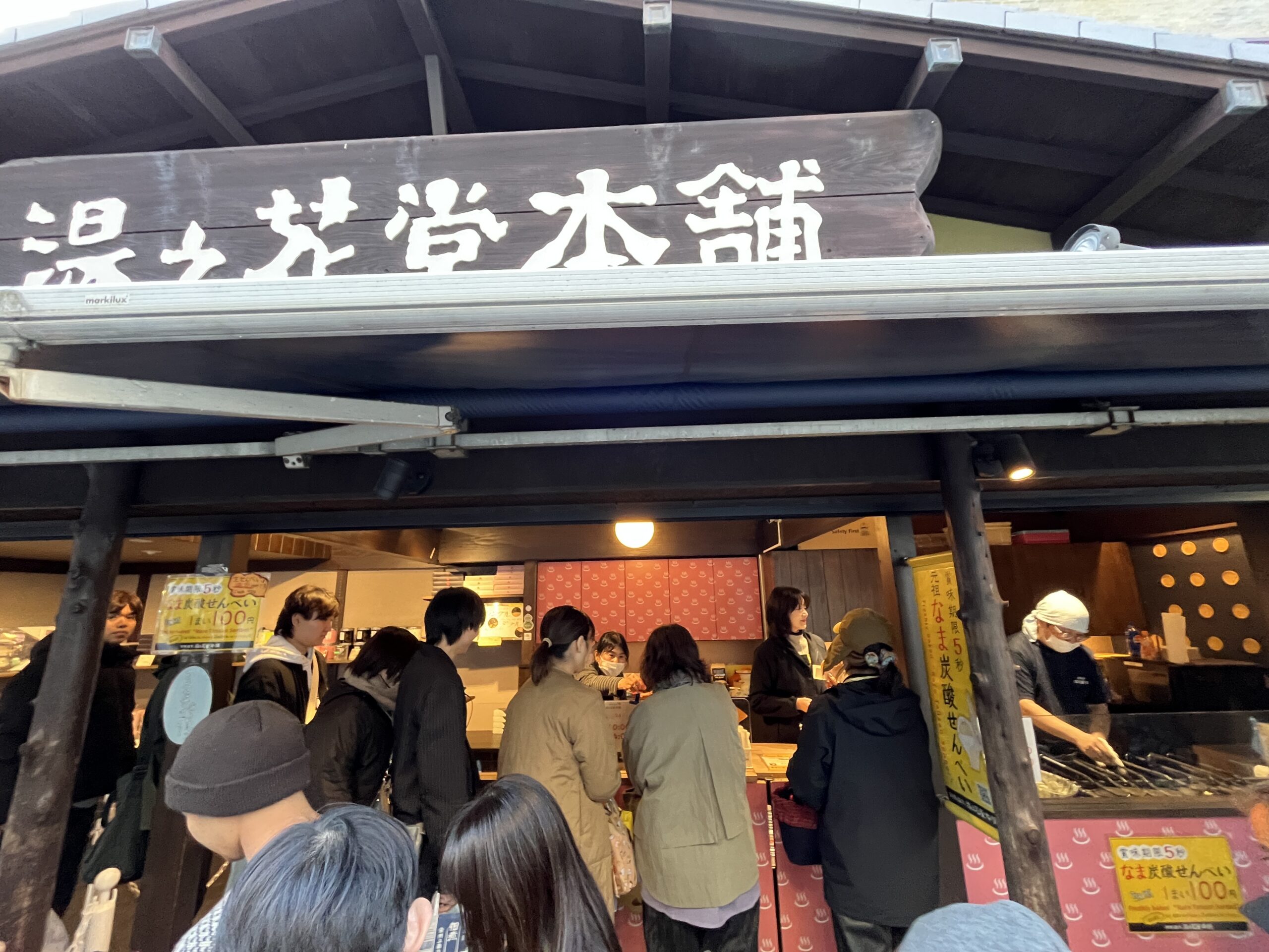 なま炭酸せんべいを売っています。多くの人が並んでいました。最初の数秒だけフニャフニャで、すぐにパリッとしました。