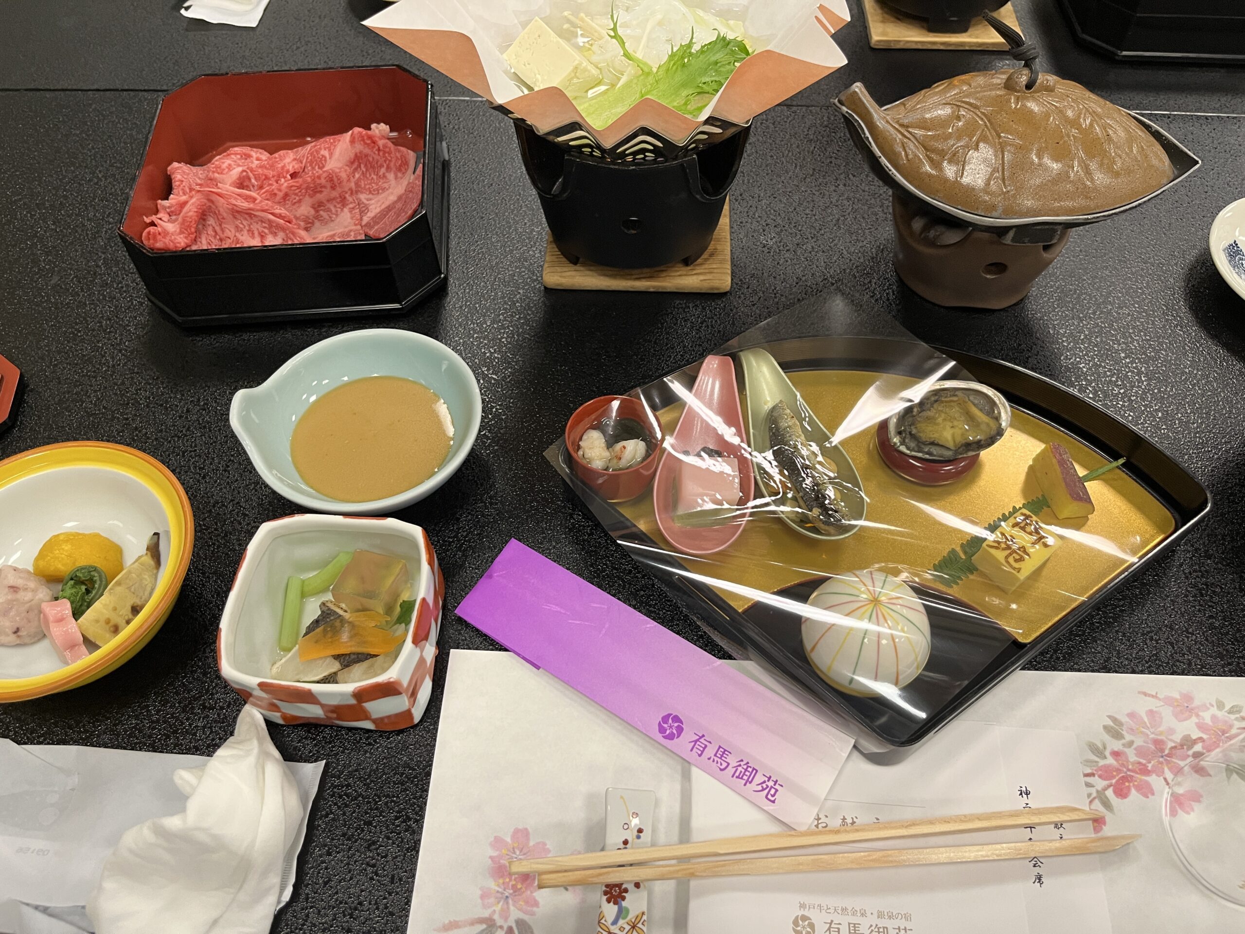 旅館の夕食です。しゃぶしゃぶがとてもおいしかったです。温泉は、もちろん、金泉、銀泉にも入りました。