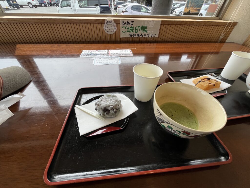 姫路城の近くで、豆大福とお抹茶をいただきました。城とお庭でずいぶん歩きました。