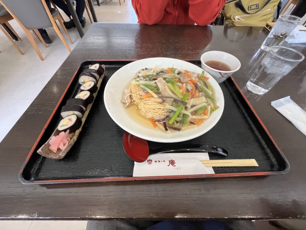 昼食に揚げそうめんの野菜あんかけ、そうめん寿司をいただきました。いろいろなそうめんの食べ方があると感心しました。中華風やイタリアン的なものまで。