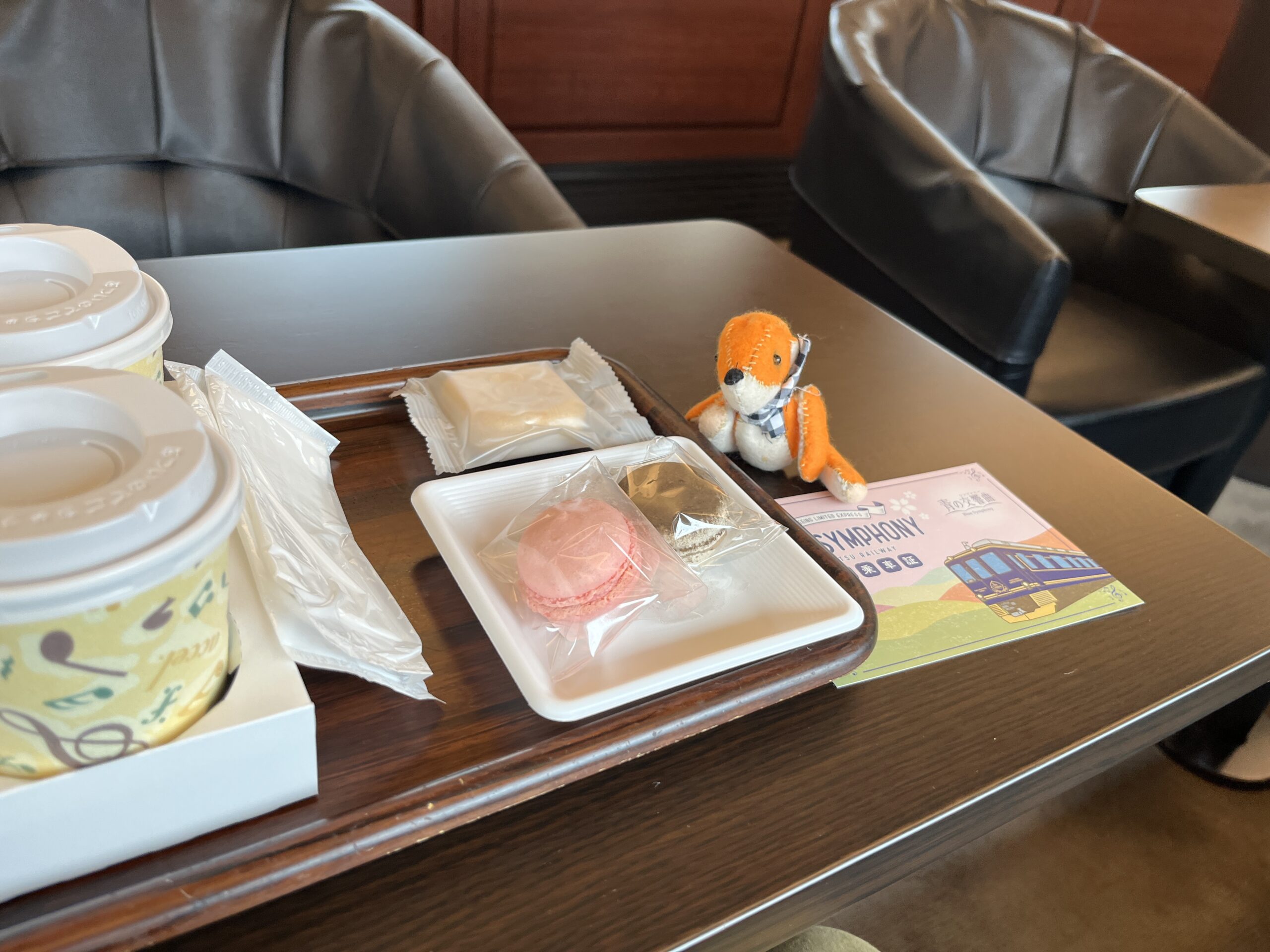 珈琲のマカロンセットをいただきました。3両の列車の真ん中の2号車は、食事やデザートを食べることができる場所です。