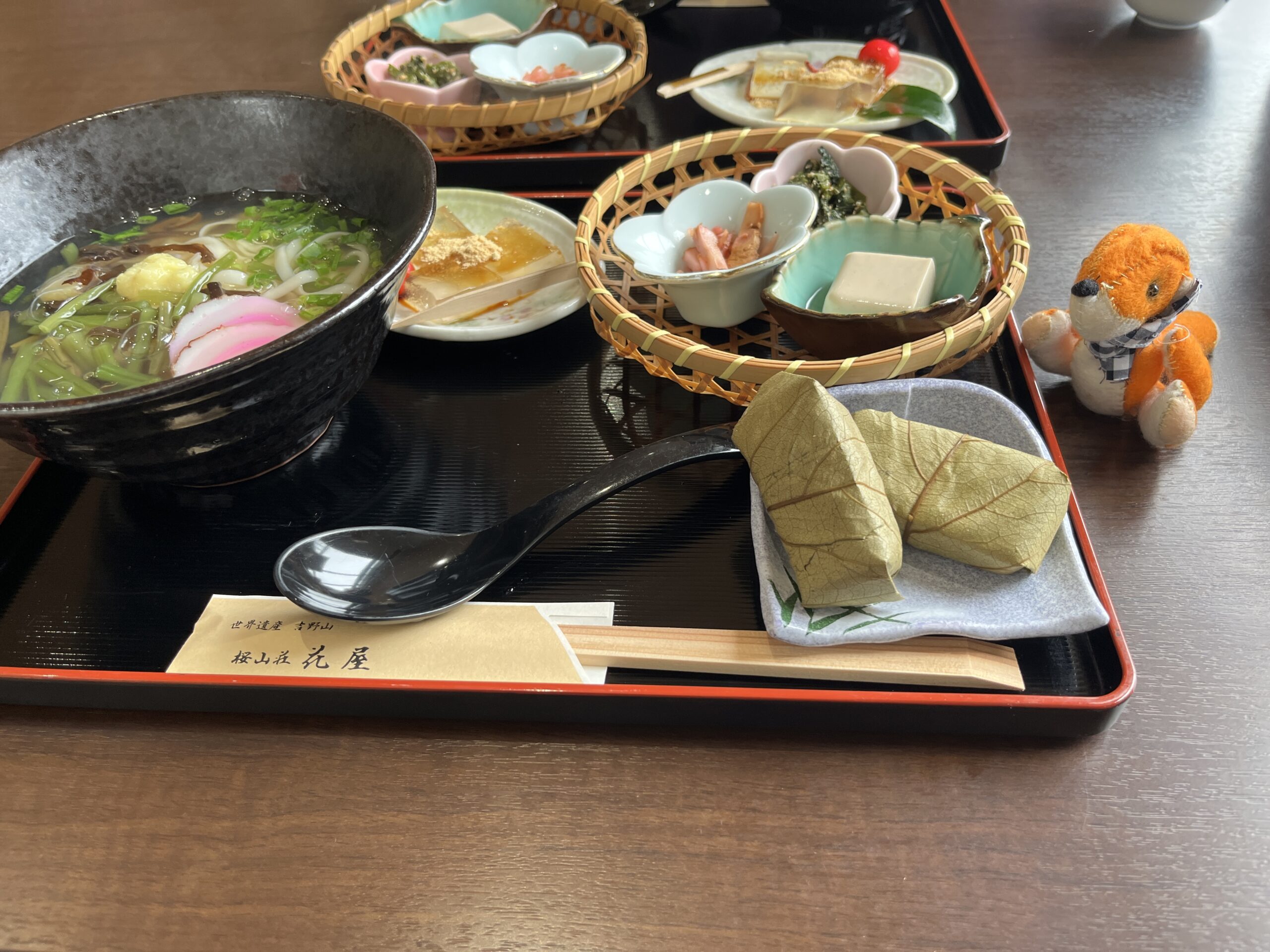 昼食は、葛うどん定食です。柿の葉寿司と葛餅がついています。吉野葛が有名ですね。お土産も葛切りなどが多いです。