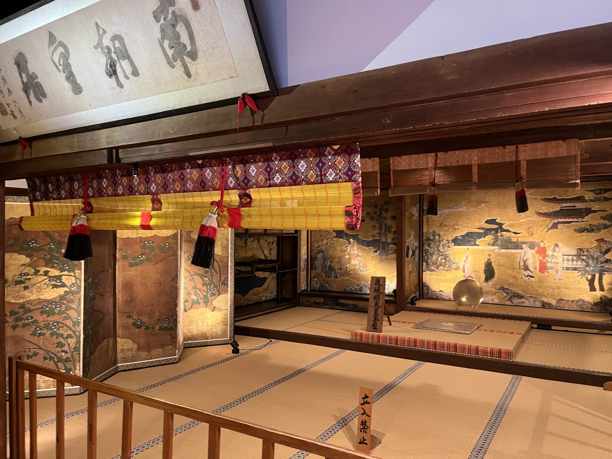 吉水神社の中にある、室町時代の南朝があった所です。ここに、当時の後醍醐天皇が座っていたんですね。700年以上前です。