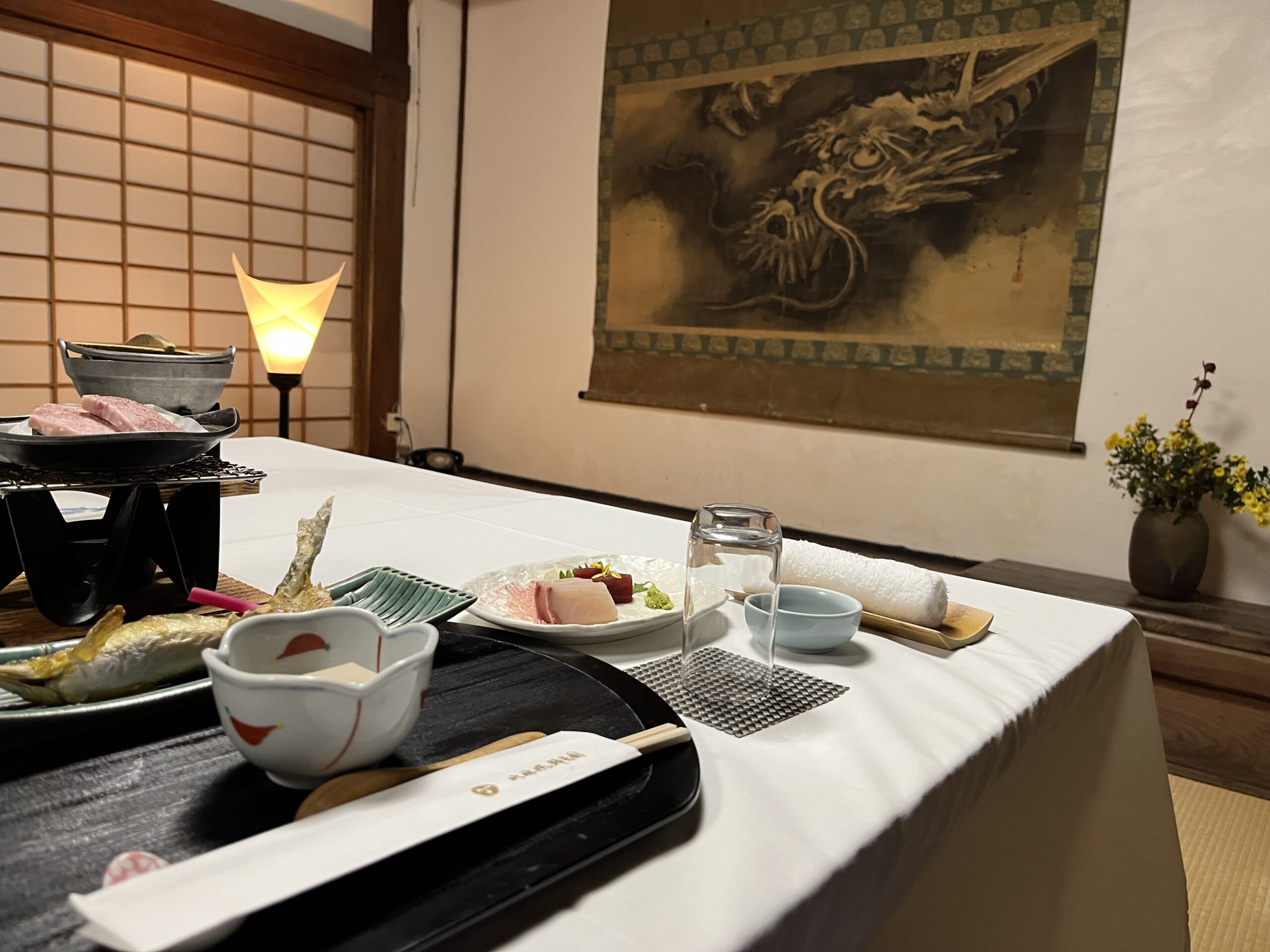 竹林院での夕食です。とても由緒ありそうな部屋での食事です。いたるところに歴史を感じるものが置いてあります。
