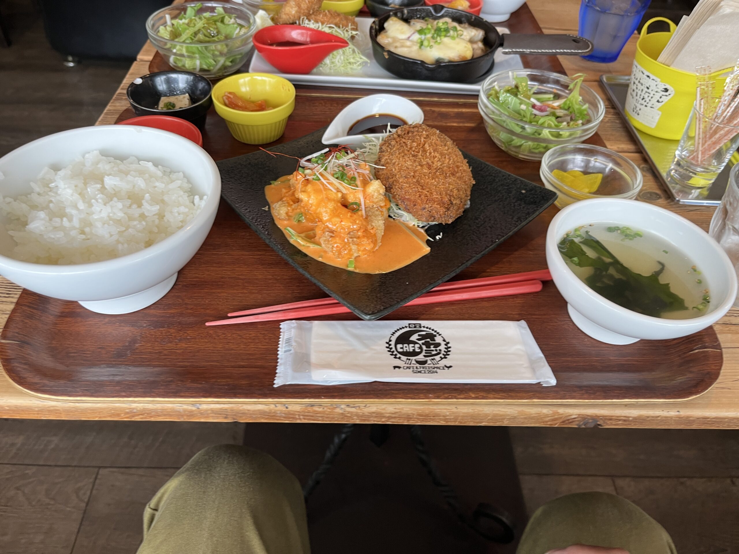 猪苗代湖の周辺でお昼をいただきました。2種類のメインを選べてボリュームのある定食でした。これは、エビチリとメンチカツの定食です。