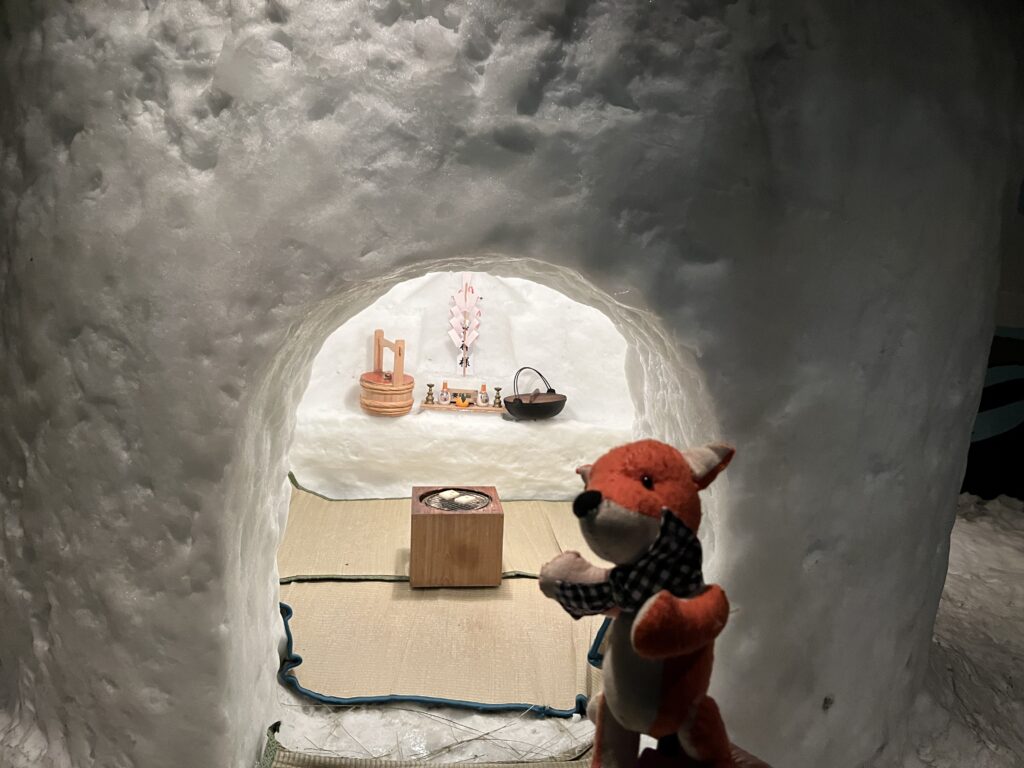 かまくら館の中には、大きな冷凍庫があり、その中にかまくらがあります。夏でもかまくらが体験できます。この季節は外にもありましたが。
