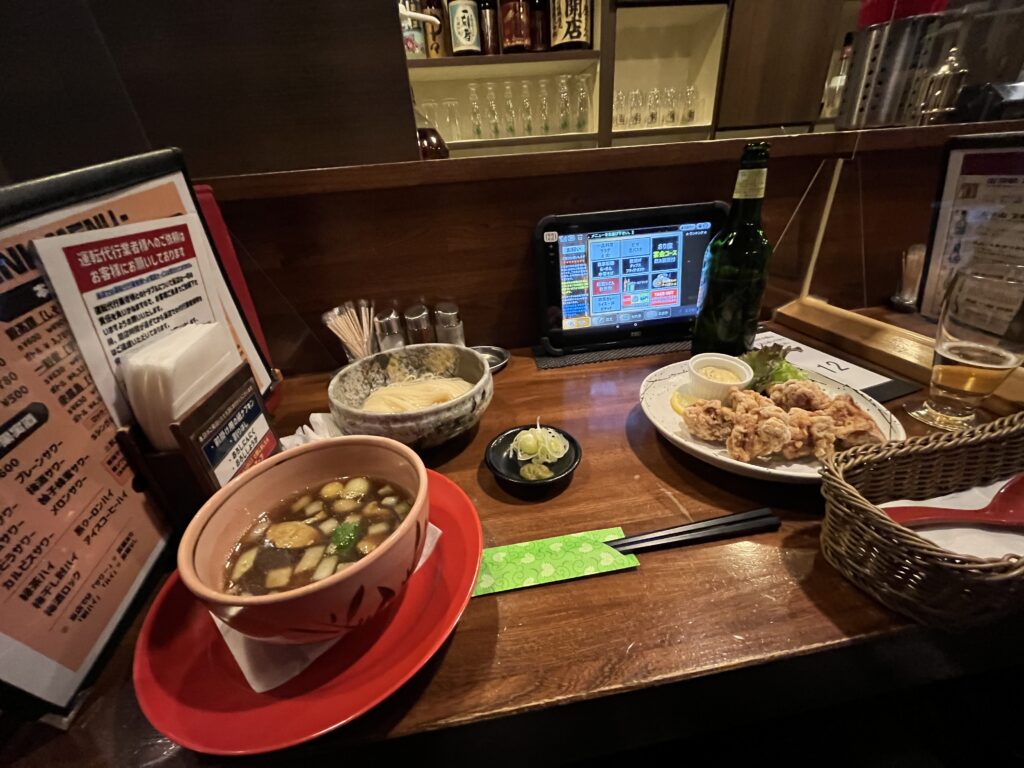 大曲駅前の店で、稲庭うどんのつけ麺と、いぶりがっこのタルタルのから揚げをいただきました。うどんがつるんとして、とてもおいしかったです。